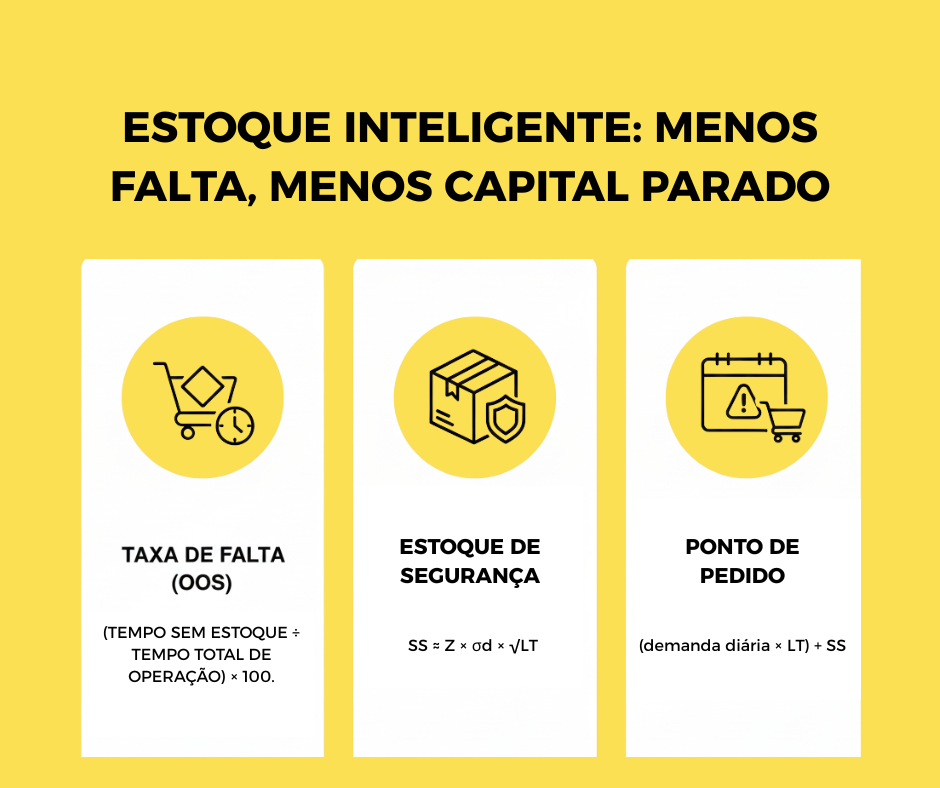 • Taxa de falta (OOS) = (tempo sem estoque ÷ tempo total de operação) × 100.